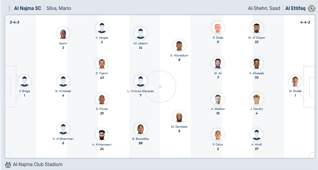 Vòng 13 giải vô địch Saudi Arabia, Al Najma sẽ tiếp Al Ettifaq trên sân nhà với mục tiêu giành một kết quả có lợi. Tuy nhiên trước đối thủ mạnh hơn nhiều thì khả nang đội chủ nhà sẽ phải nhận thêm một trận thua nữa.
