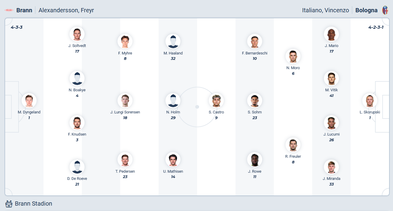 Brann là đội bóng của Na Uy, họ chỉ đứng thứ tư mùa trước tại giải vô địch quốc gia này và chưa có bất cứ dấu ấn gì tại đấu trường châu lục. Chính vì vậy việc vào đến vòng League Phase đã có thể coi là thành tích tốt của thầy trò HLV Freyr Alexandersson. Họ thể hiện rõ mình không phải đội mạnh và phải rất may mắn các cầu thủ Bann mới có thể trụ lại trong top 24 đội để vào vòng play off. Đối thủ của Brann ở vòng play off là Bologna, đội bóng nổi tiếng hơn họ nhiều đến từ Italia. Đội bóng Na Uy muốn có kết quả tốt trong trận lượt đi nhưng khả năng kịch bản đó sẽ không xảy ra bởi đối thủ mạnh và nhiều kinh nghiệm hơn họ.