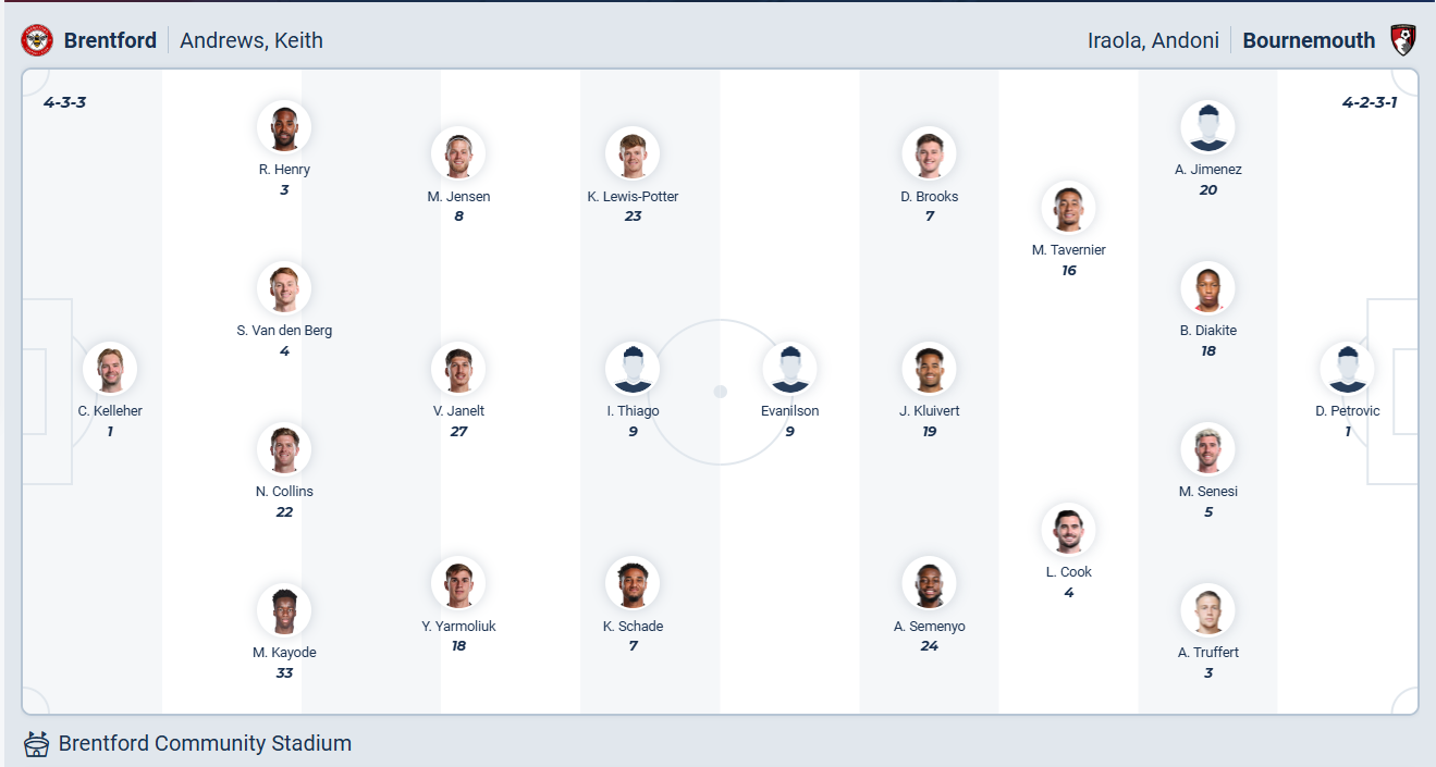 Bournemouth khác với Brentford, họ khởi đầu mùa giải rất ấn tượng với những trận bất bại liên tiếp. Tuy nhiên trong thời gian gần đây đội bóng của HLV Andoni Iraola không thể giành chiến thắng, họ liên tục mất điểm và đã tụt xuống vị trí thứ 15 trên bảng xếp hạng. 3 vòng đấu liên tiếp các cầu thủ Bournemouth đều hòa nên họ rất muốn có chiến thắng ở vòng đấu thứ 18 này, tuy nhiên trước đối thủ mà họ thường không có kết quả tốt như Brentford thì trận đấu được dự đoán không hề dễ dàng. Rất có thể Bournemouth sẽ phải nhận thất bại trận này.