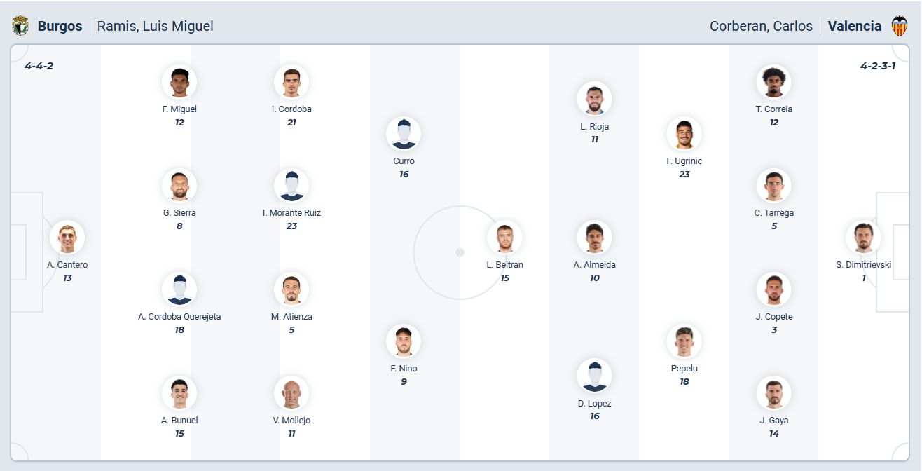 Valencia đang chơi rất tệ mùa giải này, họ chỉ thắng 1/5 vòng gần nhất tại La Liga và đang đứng thứ 18 trên bảng xếp hạng, vị trí sẽ phải xuống hạng vào cuối mùa. Với phong độ như hiện tại thì các cầu thủ của HLV Carlos Corberán cần một chiến thắng để giúp lấy lại sự tự tin, cơ hội tốt để làm điều đó khi trận đấu tới của họ ở cup nhà vua, nơi chỉ phải gặp đội bóng hạng dưới Burgos. Chính vì vậy Valencia vẫn sẽ ra sân với tinh thần tốt dù họ biết cơ hội ở cup nhà vua không cao. Nhiều khả năng Valencia sẽ chơi áp đảo đối thủ và có được chiến thắng.