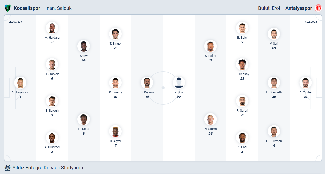 Kocaelispor là đội bóng mới thăng hạng mùa này, họ không có đội hình chất lượng tốt nên chỉ đặt mục tiêu trụ hạng lên đầu. So với mục tiêu đó thì đội bóng của HLV Selçuk İnan đang làm rất tốt khi đang đứng thứ 9 trên bảng xếp hạng, họ bất bại 5 vòng gần nhất và cơ hội trụ hạng là rất sáng. Các cầu thủ Kocaelispor muốn tiếp tục duy trì chuỗi trận ổn định này, họ muốn giành chiến thắng trước Antalyaspor. Tuy nhiên đây không phải trận đấu dễ dàng bởi đội khách không yếu, nhiều khả năng trận đấu sẽ kết thúc với tỉ số hòa.