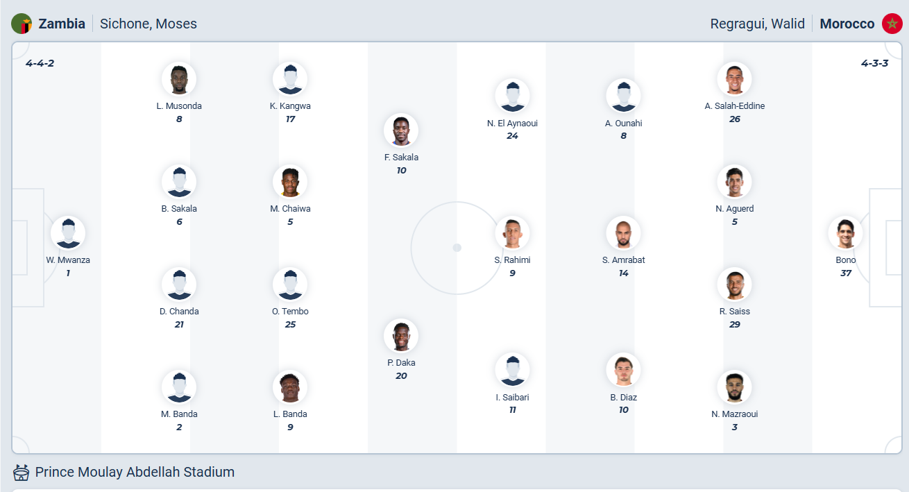 Zambia từng vô địch châu Phi năm 2012, tuy nhiên từ đó đến nay đội bóng này đã thay đổi rất nhiều. Họ không còn mạnh như xưa và giờ chỉ đứng thứ 88 trên bảng xếp hạng FIFA. Đội bóng của HLV Moses Sichone bước vào vòng chung kết AFCON năm nay với phong độ không cao khi thua 5/6 trận gần nhất. Ở trận đấu ra quân họ cũng chỉ có được trận hòa trước Mali, muốn giành vé đi tiếp thì các cầu thủ Zambia phải làm được nhiều hơn thế trước Morocco, nhưng trước đội chủ nhà có chất lượng đội hình tốt thì xem ra Zambia sẽ không thể có điểm trận này.